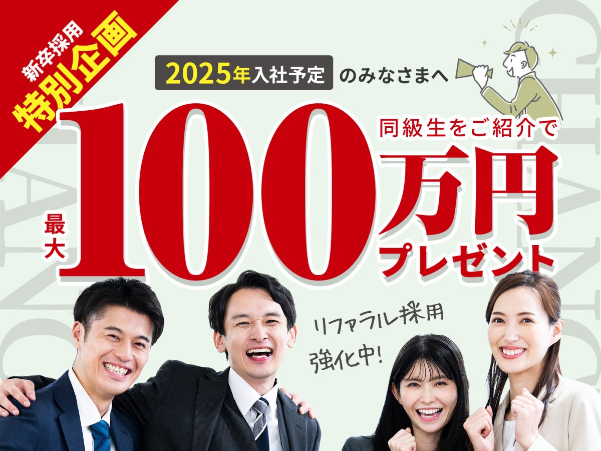 募集中の2025新卒採用にご友人を推薦していただき、ご入社されましたら、紹介者に最大100万円(税込)を贈呈します。