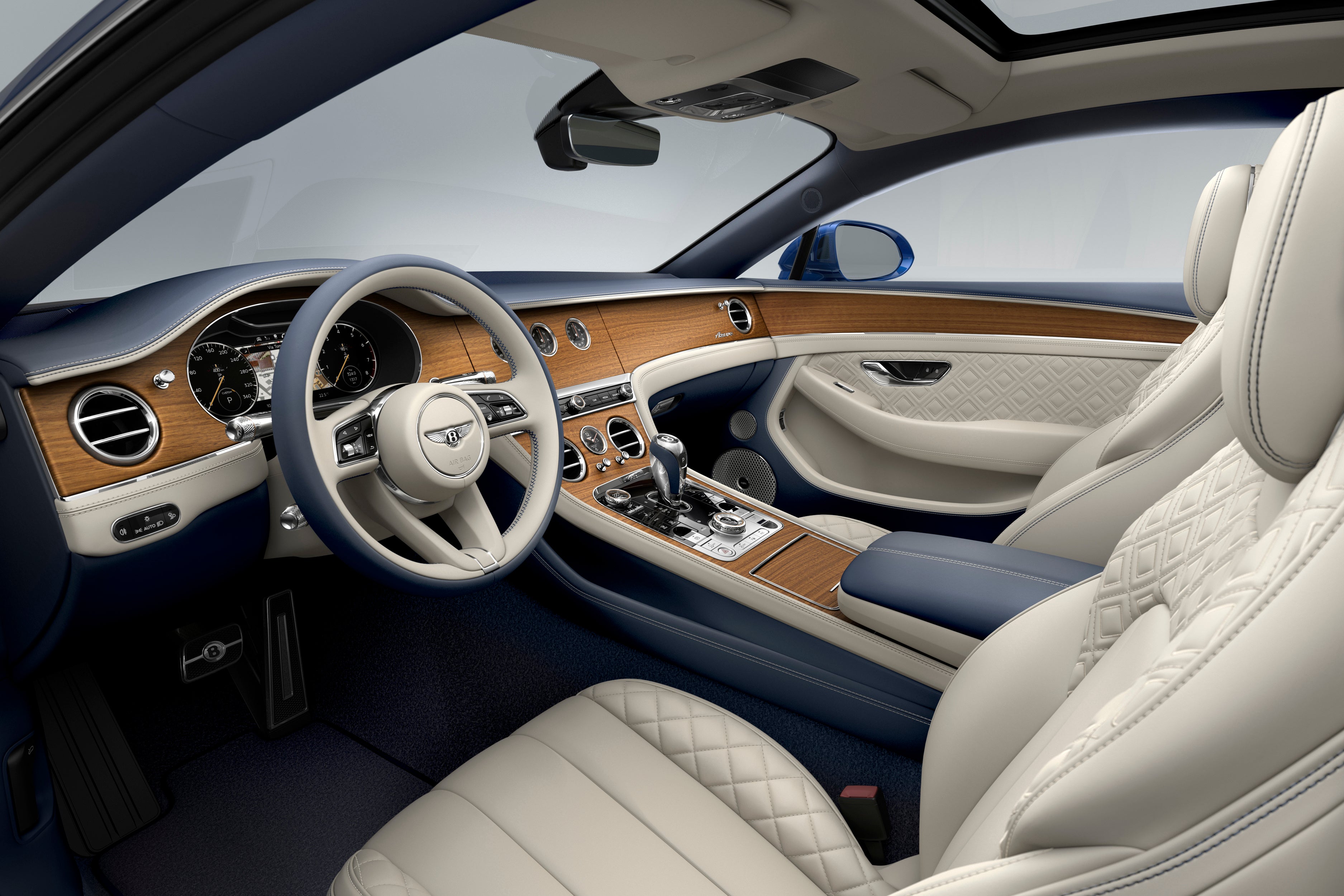 フライングスパーアズールには、ガラスとガラスを組み合わせたパノラミックサンルーフも装備されています。キャビン内を自然光で満たし、フロントパネルが傾斜して固定されたリアの上にスライドし、新鮮な空気を取り込みます。アルカンターラの電動ブラインドは、インテリアと同色で、必要に応じて日陰を提供し、レザーに代わるソフトで手触りの良い素材で作られています。コンチネンタルGTアズールのスペシフィケーションには、固定式パノラマガラスサンルーフが含まれます。