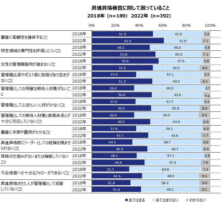 ・また、ほとんどの項目について“困っていること”として挙げられる割合が増加しています。昇進昇格審査への問題意識自体が高まっていると考えられます。
