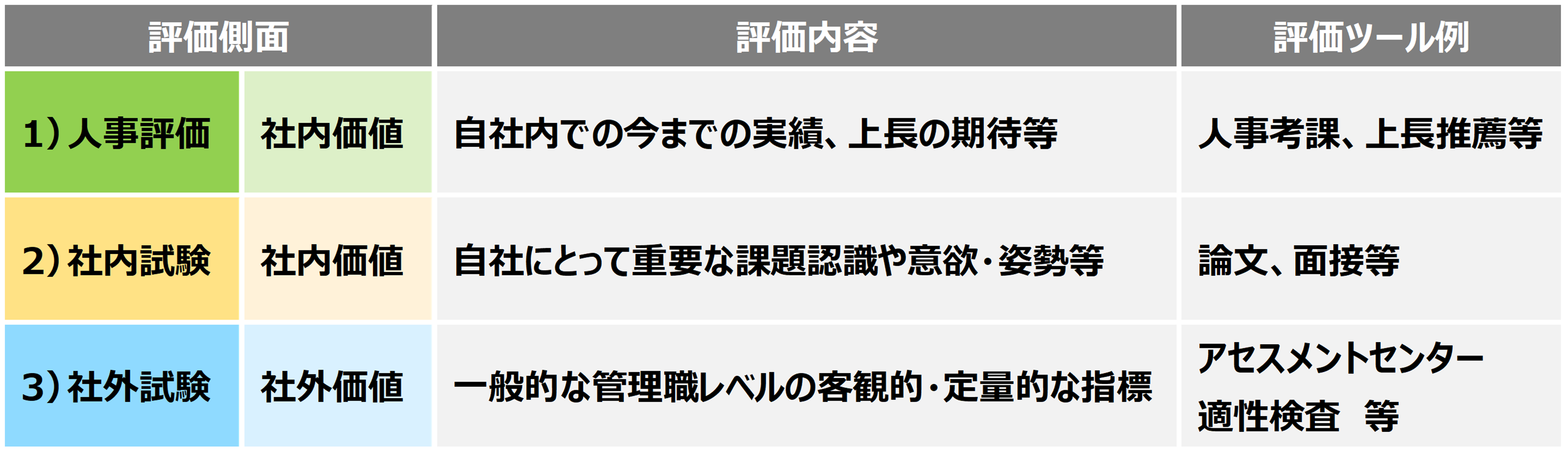 昇進昇格審査において、管理職として期待する人材像や人材要件に基づき、1)実績や期待などの人事評価と、2)社内の試験で測る社内価値、3)社外の客観的な目線の3つの側面から管理職としての適性を判断することが大切です。