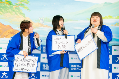 続いて登場したのは、3時のヒロインのみなさん。MCから「銭湯でのPRイベントは珍しいですね」と声をかけられると、かなでさんは「銭湯での発表会は初めてなんですけど、ちゃんと会場になるんですね!すごく新鮮です!」と笑顔でコメント。初めてのことにドキドキされながらも、リラックスした空気の中で、3時のヒロインのみなさんによるトークセッションが開始しました。