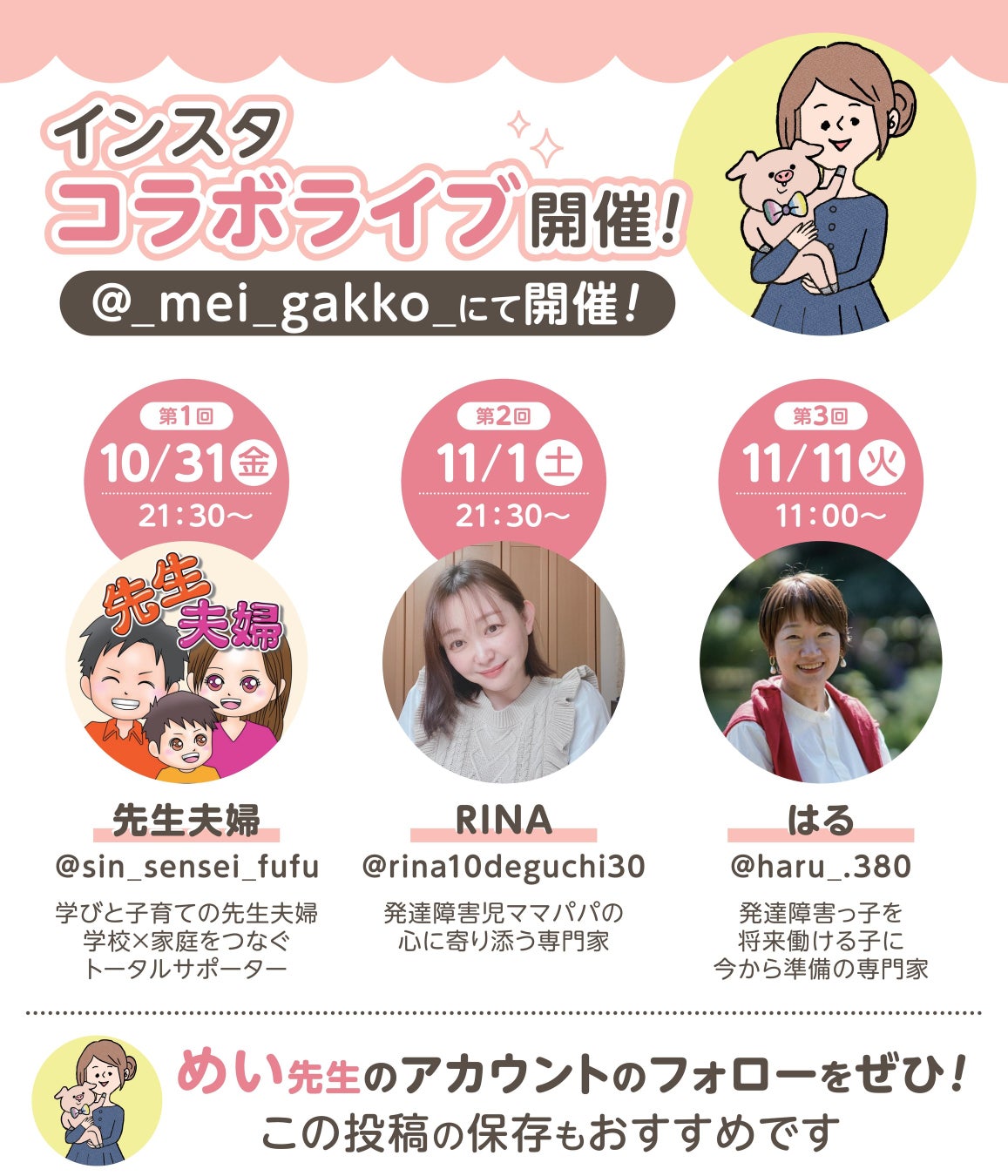 本書刊行を記念して、著者であるめい先生とInstagramにてご活躍されている3名のインフルエンサーとのコラボライブを、3回にわたり配信いたします。ご出演いただく3名の方は、発達障害の子どもたちが学校で健やかに過ごすためのサポートや、その親御さんのお悩み、進路相談のための情報発信を日々行っております。コラボライブでは、本書の内容やみなさまの専門性を活かしたお話をたっぷり語っていただきます。ぜひご覧ください!