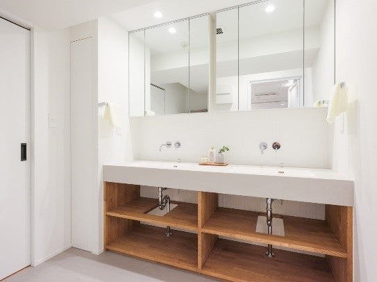 狭かった洗面室を広くし、洗面ボウルを二つ置ける大きな洗面台を造作しました。忙しい朝でも、家族並んで使える広さを確保しています。