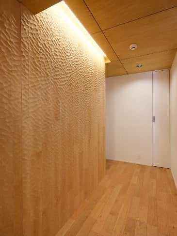 玄関に入って正面には、大伴のなぐり加工の木板が壁天井いっぱいに貼られ、光に照らされると凹凸の陰影が際立ち、目を見張る迫力があります。他にもさまざまな木の素材をバランスよく配置させており、それぞれが主張しすぎず調和した内装に仕上げています。すべての間接照明は調光できるようにし、灯りによって空間を演出できる工夫も。
