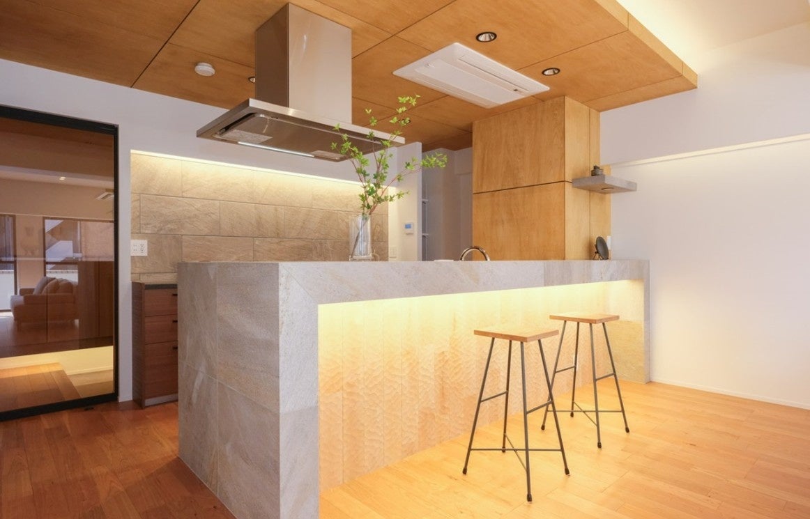 造作キッチンには表情豊かな凹凸感のある石材のタイルを天板に使い、腰板のなぐり加工の木材と合わせました。ハイスツールを置くと、キッチンカウンターを囲んでダイニングバーとしても活用できます。 寝室には小上がりのスペースがあり、木の格子で空間を分けて畳を敷いています。仕事や読書、休憩など、ひとりで静かな時間を過ごせる場所を作りました。休息の時間を過ごす寝室にはアースカラーの壁紙を、家族が集まるリビングには白い塗り壁調の明るいクロスを採用しています。どれも、床や造作の木材と相性の良い素材です。