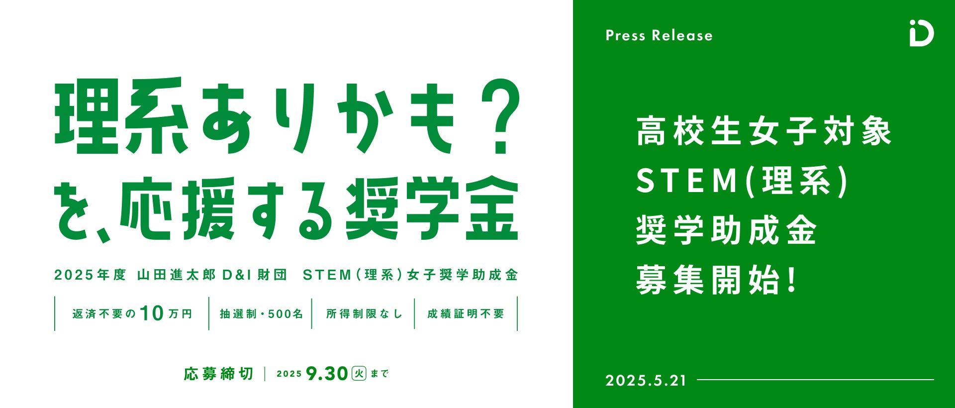 公益財団法人山田進太郎D&I財団は、高校生女子が文理選択時に理系を選択することを支援する、抽選制*1・返済不要の「STEM(理系)女子奨学助成金」の5期目の募集を5月21日に開始します。今回は、文理選択に悩む方にとっても「もし理系に進んだら?」という可能性に目を向けるきっかけになればとの思いから、例年より約2か月早く、5月から募集を開始します。当財団は2021年の開始以来、累計約1,700人に総額約2億2,000万円*2を支給し、理系進学の後押しとなった声も多く寄せられています。今年度も全国約500人の生徒を対象に一人当たり10万円の奨学助成金を提供します。