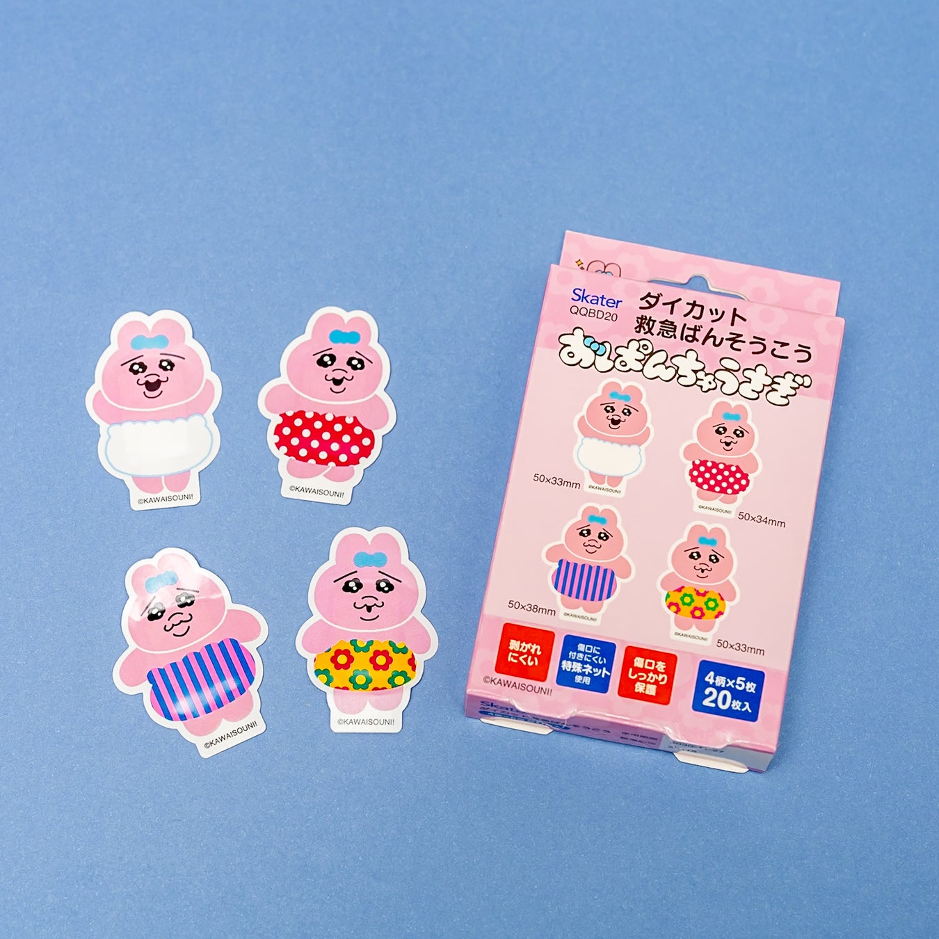 表情豊かな「おぱんちゅうさぎ」のデザインで、怪我のケアも少し楽しく。 持ち運びに便利なボックス入りで、機能性も備えた救急絆創膏。