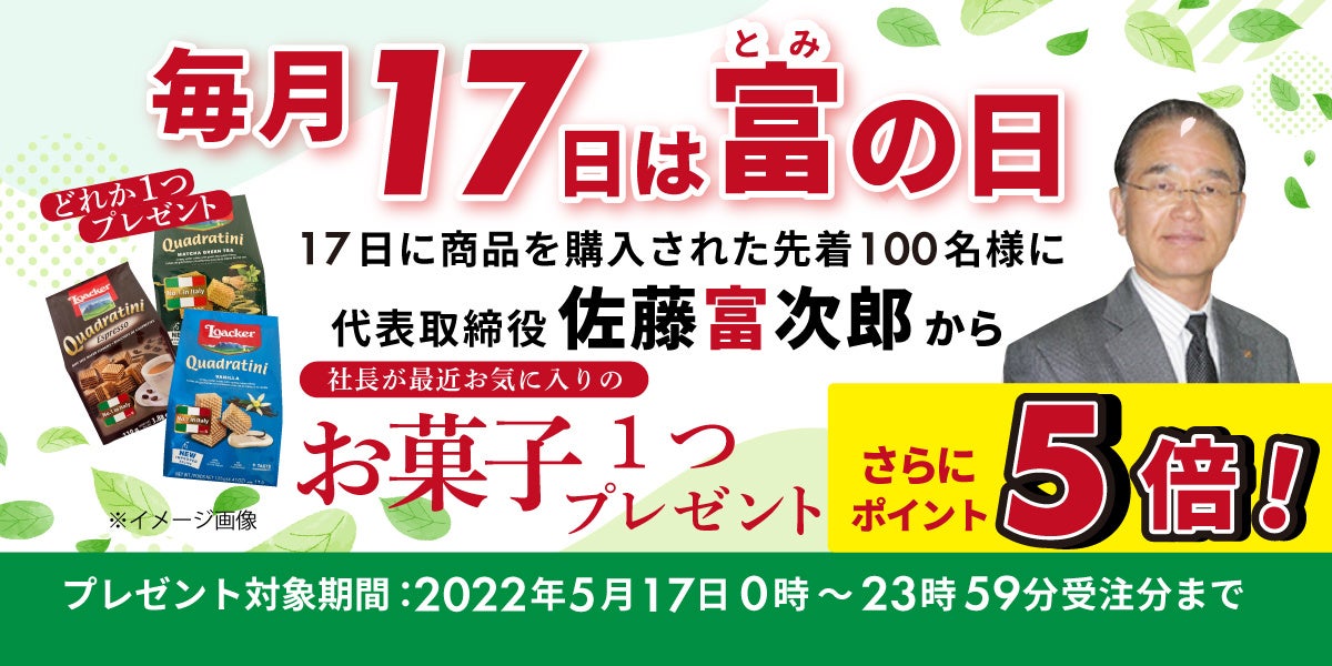 キャンペーン第6回目の5月17日(火)は、商品をご購入された先着100名様に“社長がお気に入りの”逸品「お菓子」1つをプレゼントいたします。さらに「ポイント5倍」になります。