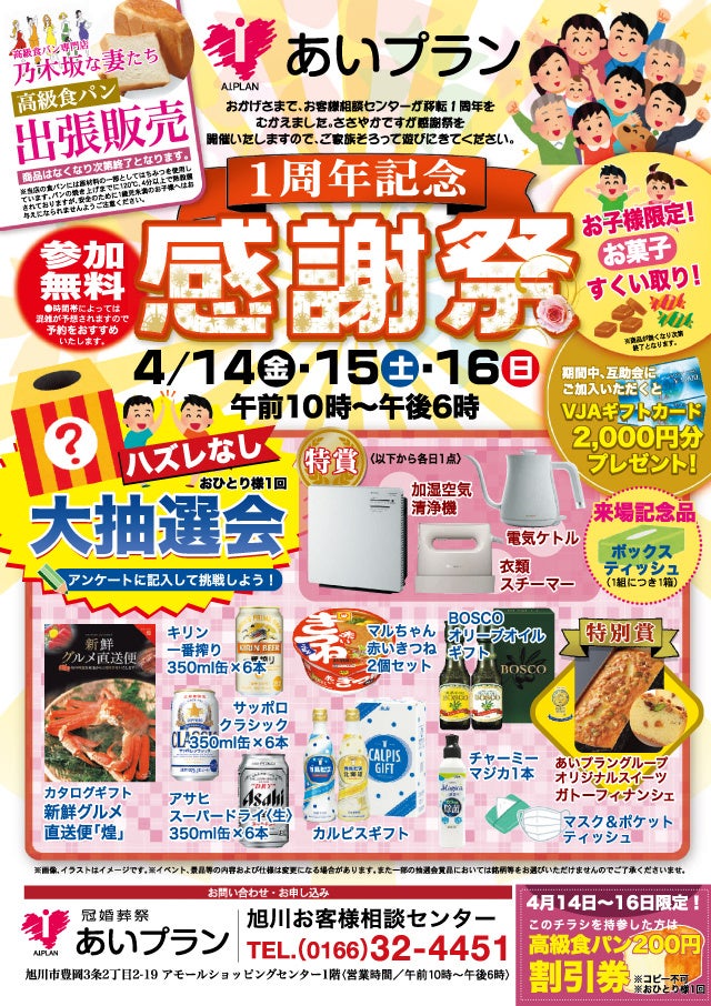 あいプランお客様相談センターの移転1周年を記念して4月14日~16日の3日間感謝祭を開催! 豪華賞品が当たる大抽選会やお子様限定イベント、高級食パンの出張販売など楽しい企画をご用意しております。