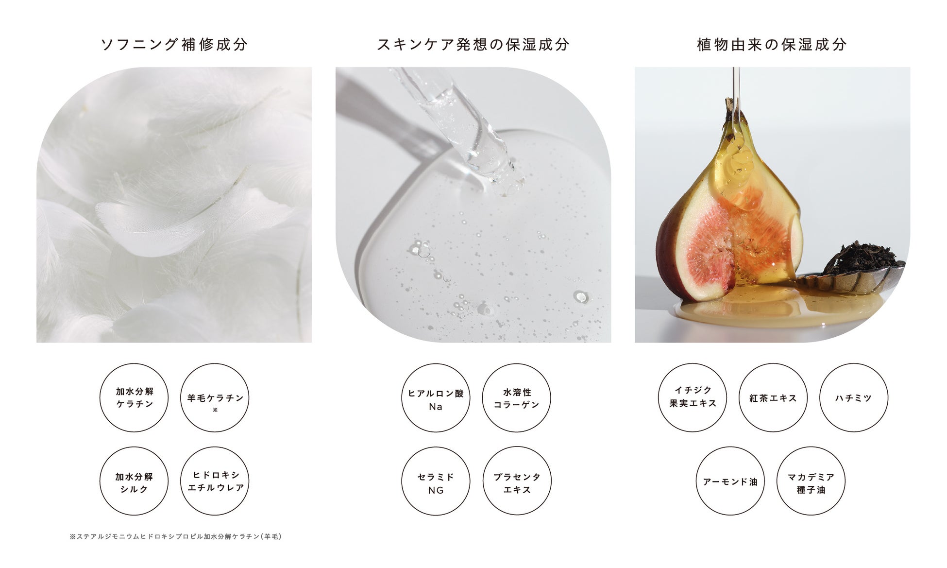 その場しのぎのケアではなく、使い続けることで髪を健康的な状態へ近づける処方設計を追求。髪に栄養を与え、内側からダメージを補修する成分をベースに、乾燥やダメージによるかたい質感に悩む方に向けたこだわりの保湿成分を、ベストなバランスで配合しました。