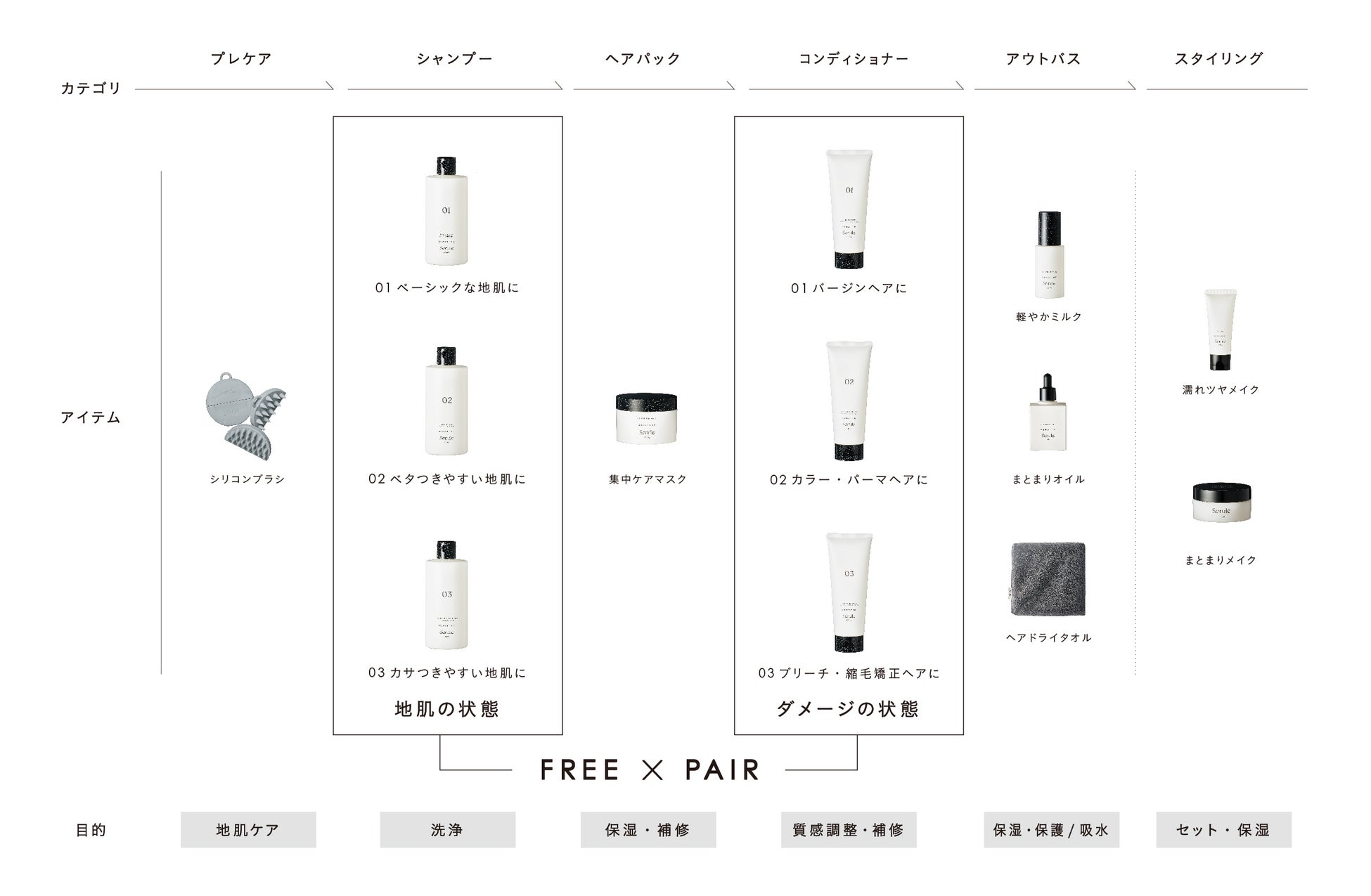 シャンプーは地肌の状態、コンディショナーはダメージの状態に応じた各3タイプ展開。自分の状態にあわせて、組み合わせを自由に選択できます。そのほか、アウトバスアイテム、スタイリング剤、ツールなど、目的にあわせ必要なものをカスタマイズできるラインナップをご用意。