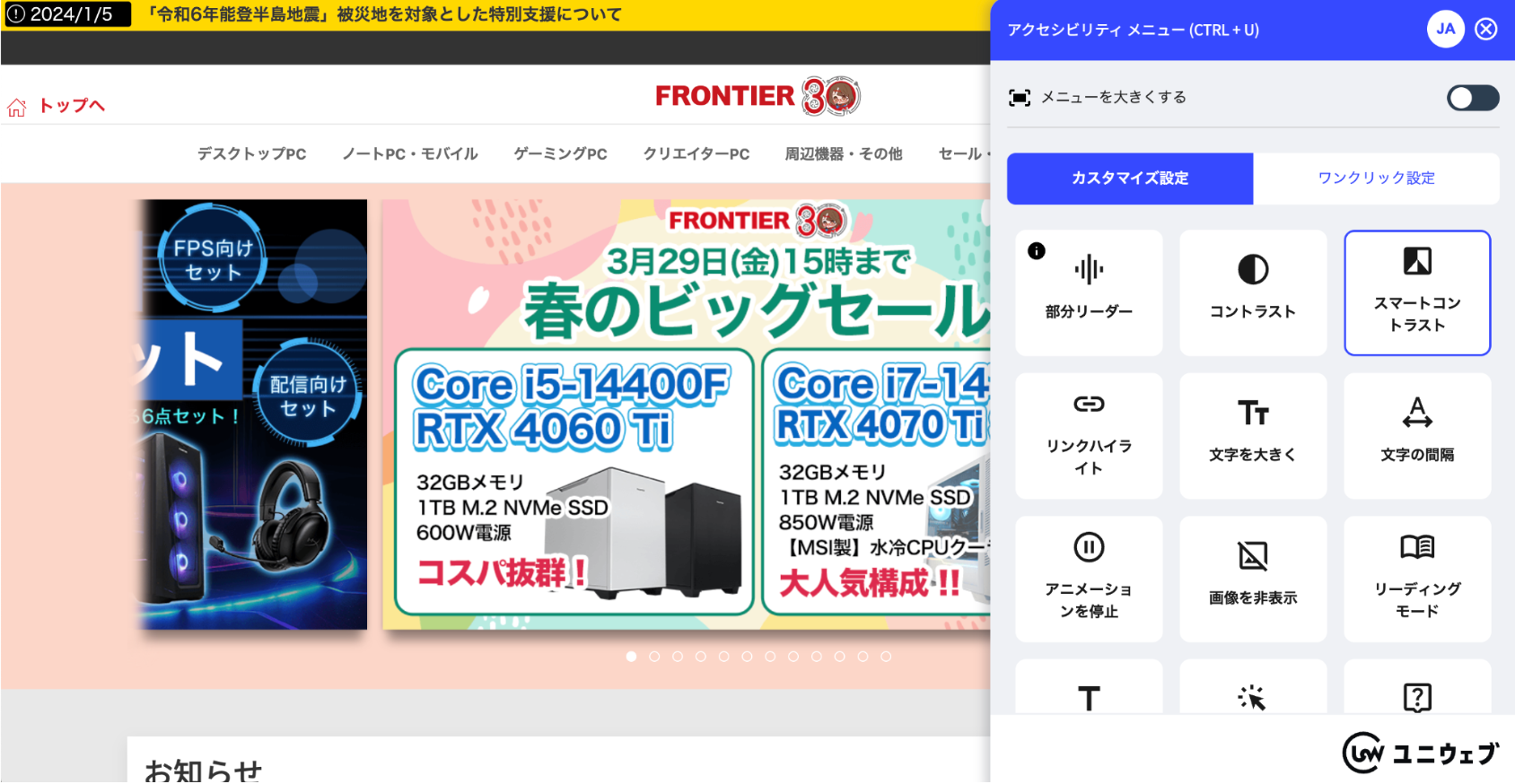 右側にユニウェブのアイコンが設置されました。アイコンをクリックすると、アクセシビリティメニューが表示されます。