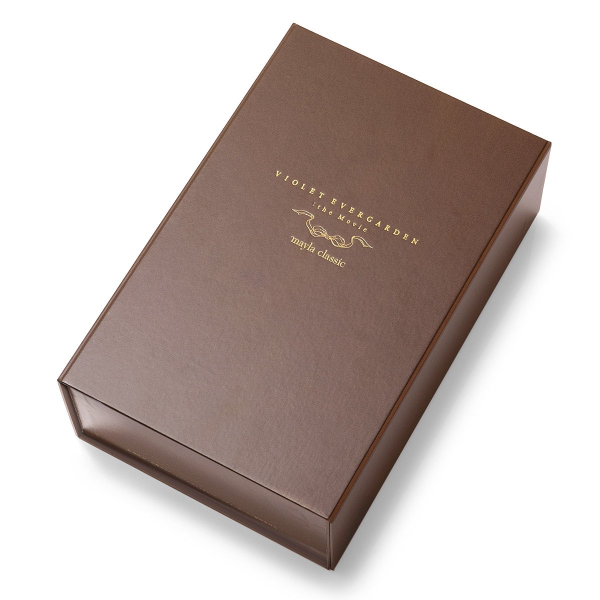 商品は、ヴァイオレットのトランクケースをイメージしてアンティークなブラウンに金色の箔押しが施された、高級感溢れるシューズボックスでお届け致します。
