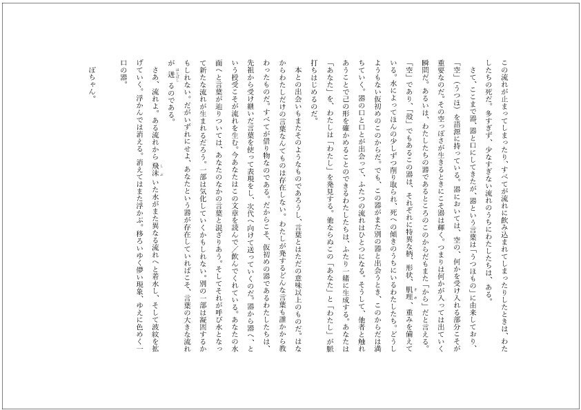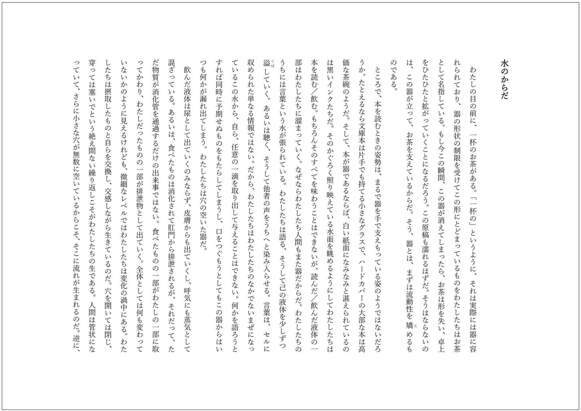 目の前にある一杯のお茶から哲学的に広がる表現力は、まさに“本を飲む(読む)”感覚を与えてくれます。もしかすると、この世には多くの、「器」と呼べるものが存在しているのかもしれません。そして、それがいずれは、私たちの生に繋がっているかもしれないことが尊く、美しく、この言葉たちを何度も反芻し、味わいたくなるような作品でした。
