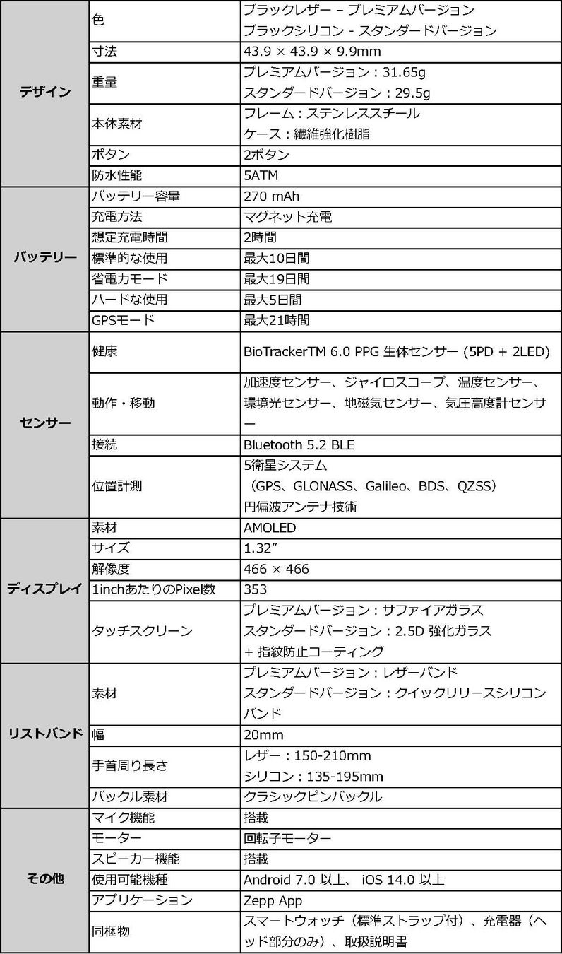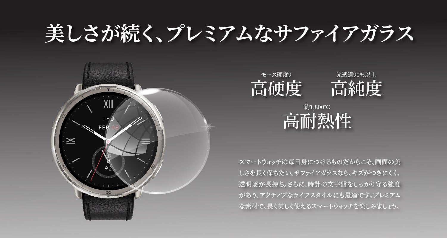 本製品は、ステンレススチール製のエレガントな本体を採用しており、プレミアムバージョンではサファイアガラスと本革レザーバンドを搭載することで、高級感をさらに引き立てています。また、実質的な前モデルであるAmazfit GTR Miniと比較して、物理ボタンが1つから2つに増加し、操作性が大幅に向上しました。さらに、健康管理やフィットネス機能も強化されており、日常生活をより快適にサポートする次世代モデルとして期待されています。