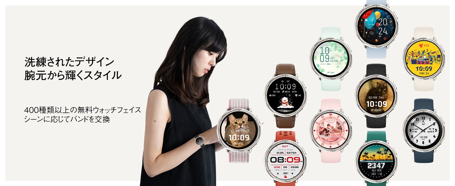 Amazfit Active 2では、有料・無料を合わせて400種類以上のウォッチフェイスが利用可能です。クラシックなアナログデザインからモダンなデジタルデザインまで幅広く揃い、ビジネスやカジュアル、スポーツなどあらゆるシーンに対応します。男性向けだけでなく女性向けのデザインも充実しており、気分やスタイルに合わせて簡単に変更可能です。また、Zeppアプリを通じたカスタマイズや写真を背景に設定する機能も備え、個性を表現する楽しさを提供します。