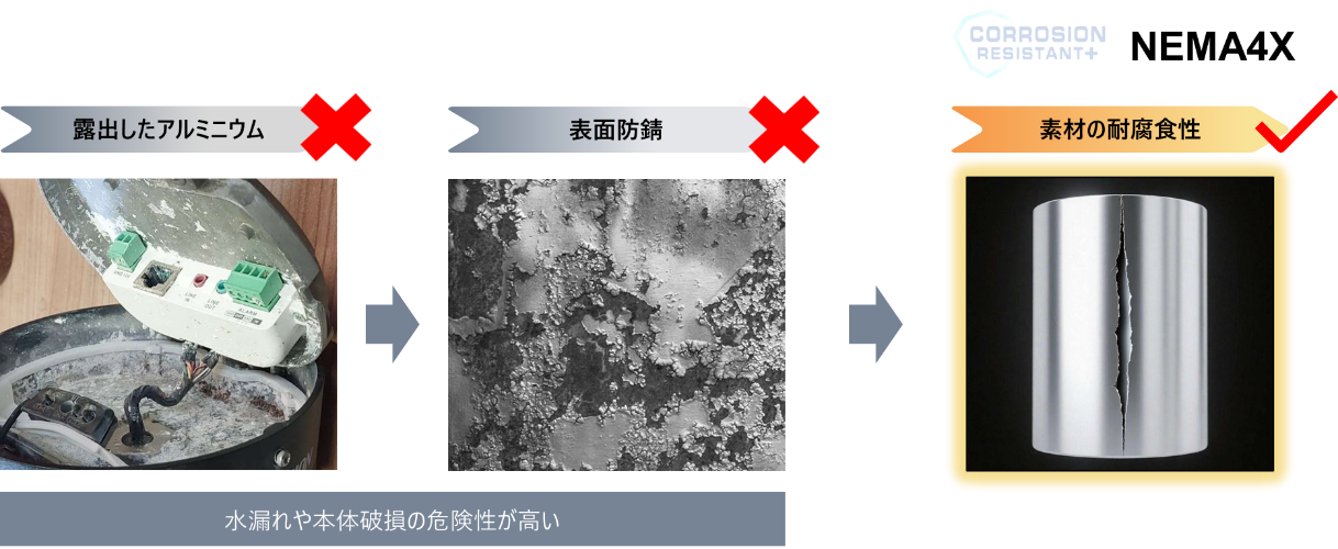 NEMA 4X 耐食性能:耐食素材を採用。表面が傷ついても内部の耐食性が維持されるため、沿岸部などの厳しい環境下でも安心して使用できます。
