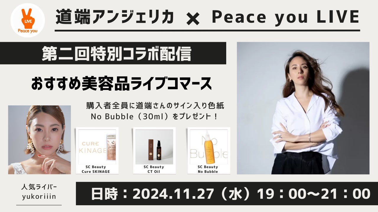 合同会社ピースユー(本社:東京都千代田区、職務執行者:藤瀬公耀)が運営する日本最大級のライブコマースアプリ「Peace you LIVE」(以下「ピースユーライブ」)は、2024年11月27日(水)19時より、第二回『道端アンジェリカ×Peace you LIVE』特別コラボ配信を実施します。