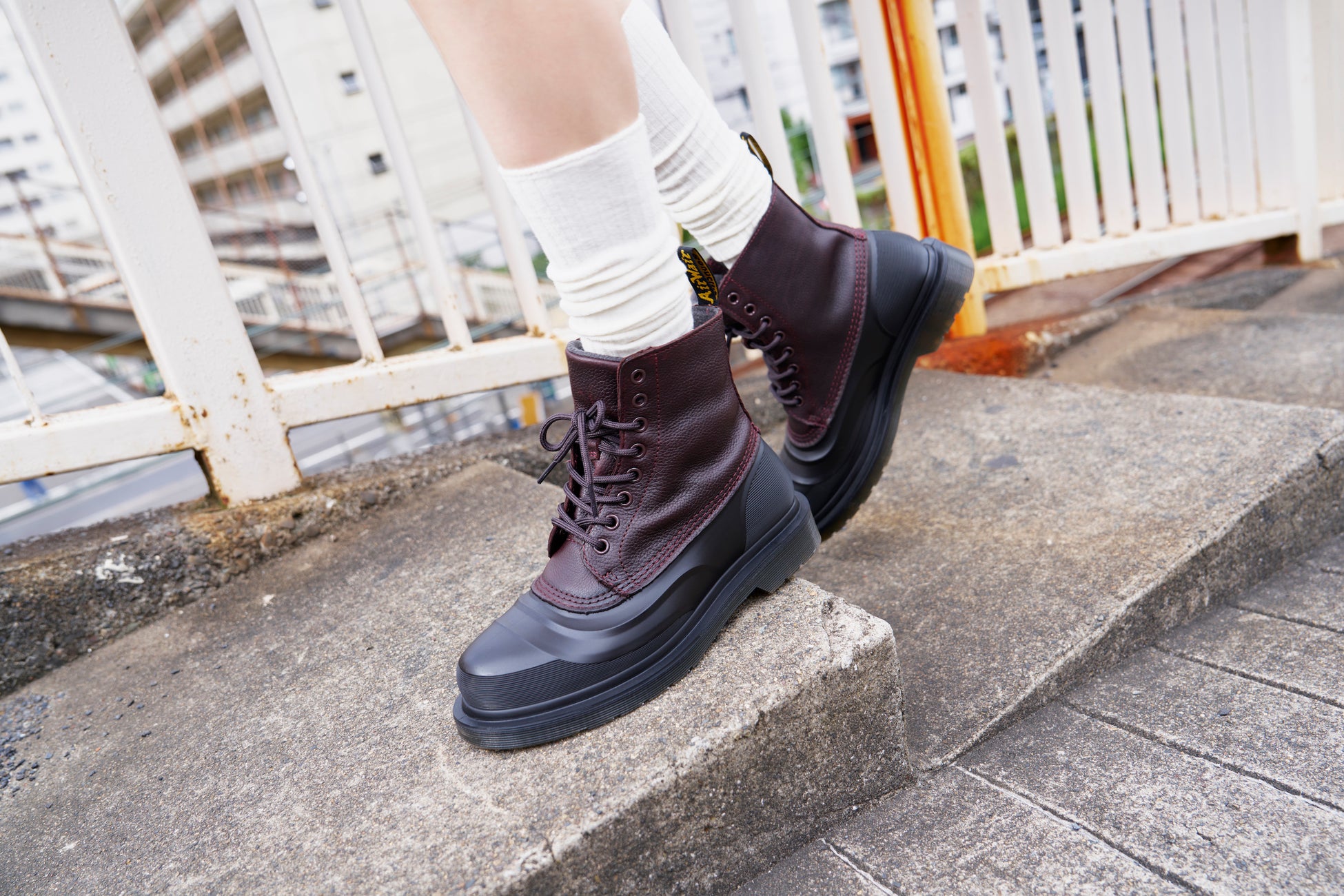 1460 Sub Boot: 雨天に対応するために再設計された1460 8ホールブーツの新しい構造は、ドクターマーチンのワーキングブーツの伝統と精神を受け継ぎながら、先進的な機能を備えている。防水ベースアウトソールとドクターマーチンのバウンシングソールという名前の由来であるエアクッションソールは、ピューリタンステッチラインまで補強され、耐水性を劇的に向上。高い通気性と耐水性を持つニューレンズレザーとフリースライニングを組み合わせ、保護と快適さを両立させている。ドクターマーチンの象徴的な1460 8ホールブーツのシルエットとヒールループを備え、オリジンは劇的な進化を遂げている。