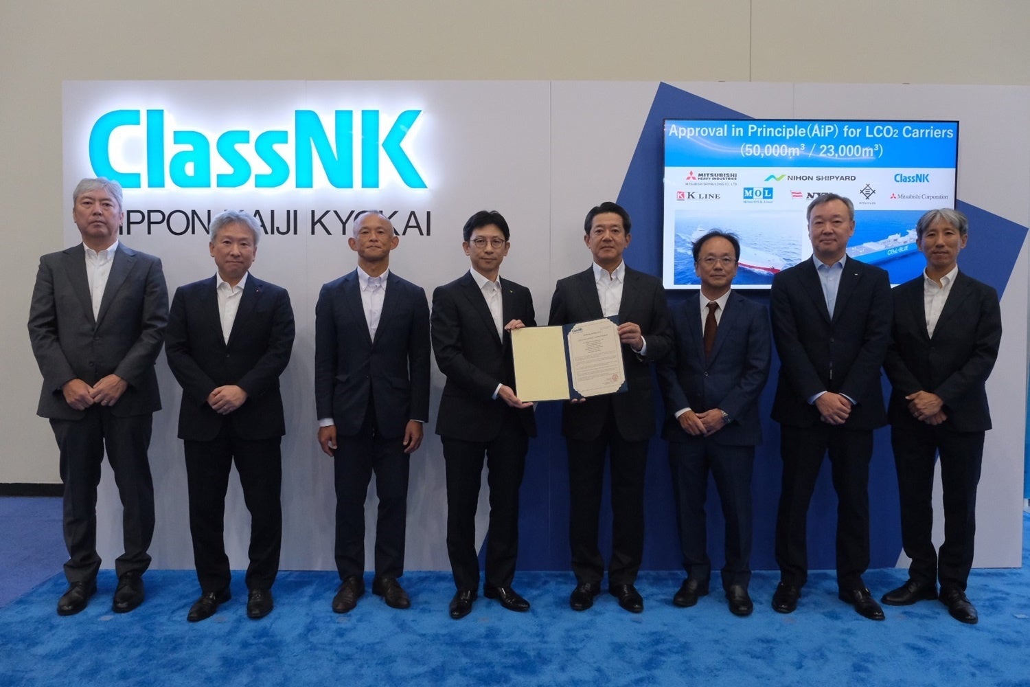 三井物産株式会社(社長:堀 健一、本社:東京都千代田区)、川崎汽船株式会社(社長:明珍 幸一、本社:東京都千代田区)、株式会社商船三井(社長:橋本 剛、本社:東京都港区)、今治造船株式会社とジャパン マリンユナイテッド株式会社の共同営業設計会社である日本シップヤード株式会社(社長:檜垣 清志、本社:東京都千代田区)、日本郵船株式会社(社長:曽我 貴也、本社:東京都千代田区)、三菱商事株式会社(社長:中西 勝也、本社:東京都千代田区)、三菱重工グループの三菱造船株式会社(社長:上田 伸、本社:東京都港区)は、低圧仕様の液化CO2輸送船(LCO2輸送船)の2船型について、アメリカ船級協会(ABS、本部:テキサス州)および 一般財団法人日本海事協会(NK、本部:東京都千代田区)から基本設計承認(Approval in Principle : AiP)(※1)を取得しました。