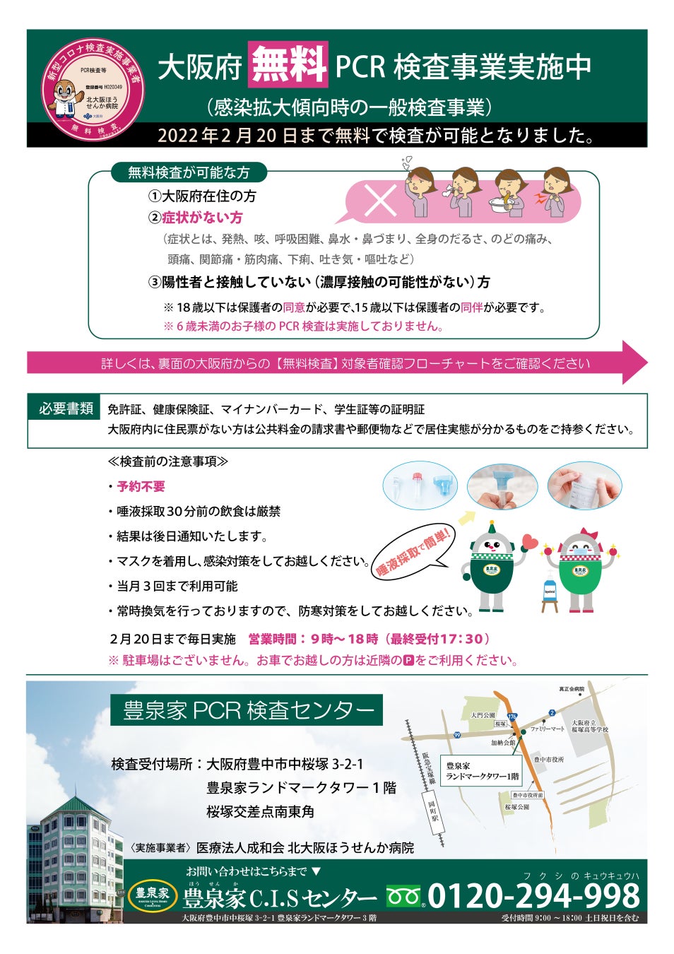 【大阪府豊中市 無料PCR検査】新型コロナ検査実施事業者として、豊泉家グループで無料PCR検査を実施しております。【実施場所:大阪府豊中市中桜塚3-2-1】