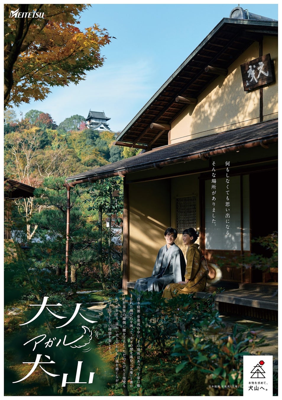 広告では、夫婦で犬山を旅する中で、普段は見逃してしまう街の魅力やお互いの魅力に気付き合う「ふたりの歴史、これから」篇の新たなポスターを2種展開します。江戸時代からの町割りが残る城下町を着物で散策したり、日本庭園 有楽苑内にある「元庵」でゆったりとした時間を過ごしたり、大人が思わず惹きつけられてしまう犬山の「本物」の魅力を深掘りします。