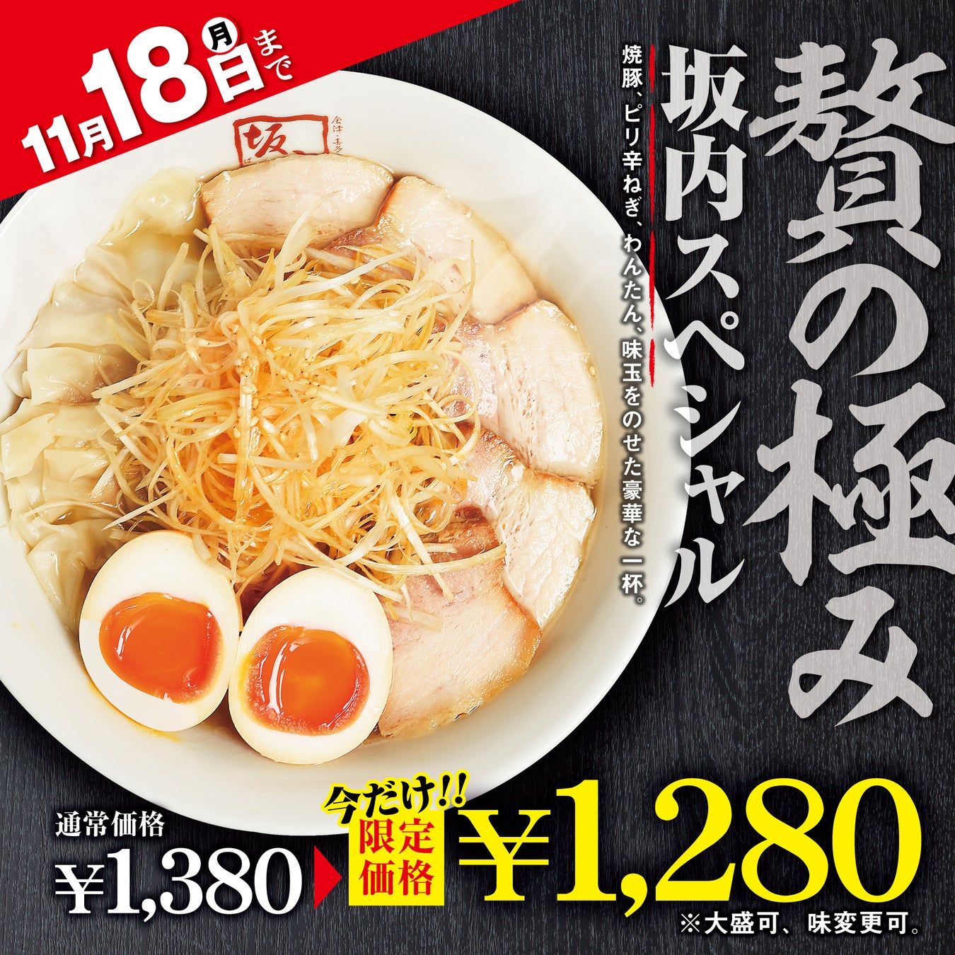 グランドメニューの「喜多方ラーメン」に「ピリ辛ねぎ」「味付玉子」「わんたん(6個)」トッピングを追加すると合計金額は1,380円となりますが、期間中は多くの方に召し上がっていただきたい想いから、1,280円でご提供いたします!さらに坂内公式アプリ会員様へは100円引きクーポンもプレゼント。 わがままを叶えたようなスペシャルな一杯は季節の変わり目のパワーチャージにぴったりです。