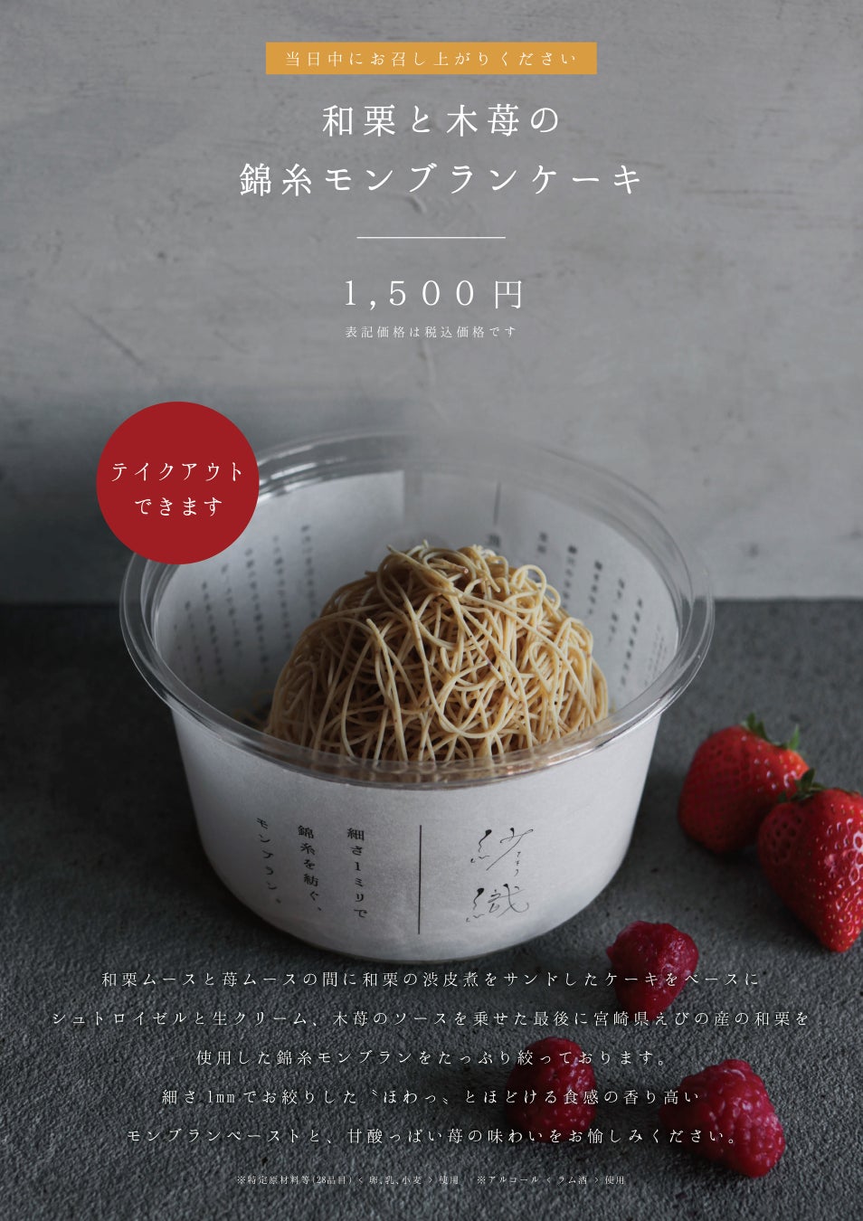 和栗の奥深さと、見た目の美しさを兼ね備えた『紗織』自慢のスイーツを、この機会にぜひご堪能ください。皆様のご来場を心よりお待ちしております。