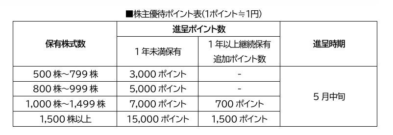 進呈条件:2025年以降、毎年3月末日現在の株主名簿に、5単元(500株)以上保有する株主