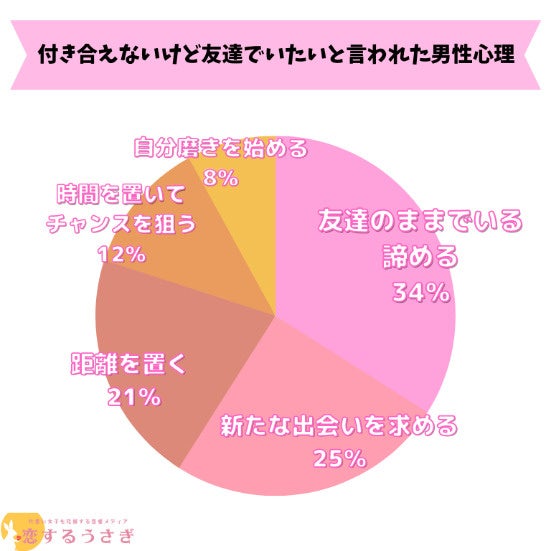 恋するうさぎ編集部が行った「付き合えないけど友達でいたいと言われた男性心理」のアンケートによると1位友達のままでいる/諦めるが34%、 2位は新たな出会いを求めるが25%、3位は距離を置くが21%という結果になりました。