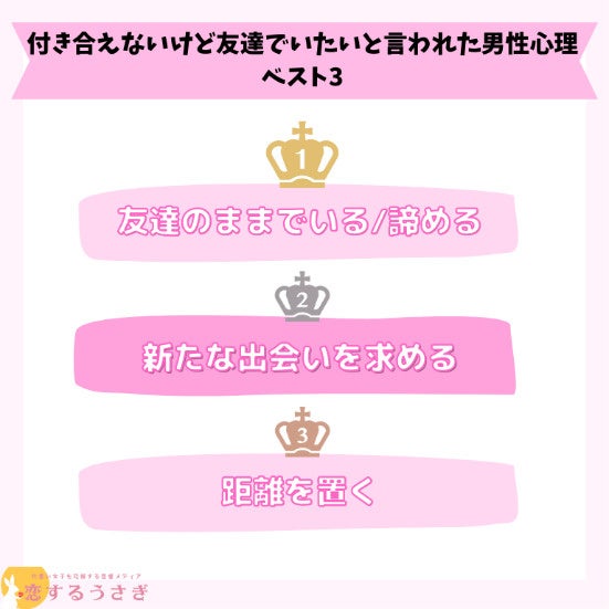 順位 | 割合 | 付き合えないけど友達でいたいと言われた男性心理 |