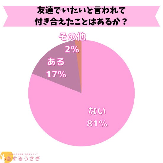 恋するうさぎ編集部が行った「友達でいたい」と言われたが付き合えたことはあるかのアンケートによると1位ないが81%、 2位はあるが17%、3位はその他が2%という結果になりました。