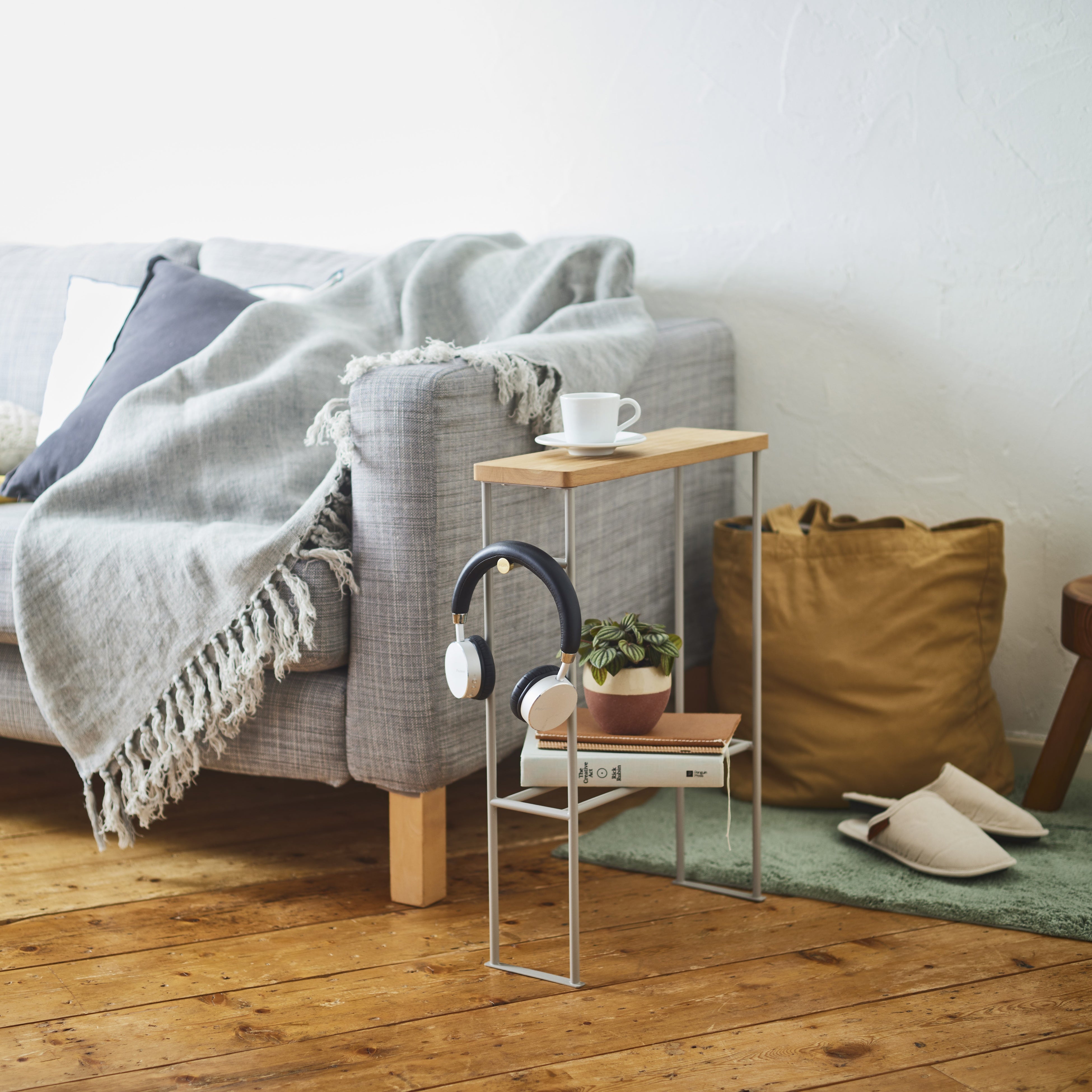 廊下などの限られたスペースにも置きやすいサイズのスリムラック。天板には小物類、下部のバーには散らかりがちなスリッパ、サイドのアームには折りたたみ傘やエコバッグを収納でき、お出かけ時のマストアイテムをコンパクトにまとめられます。圧迫感なく空間になじむデザインのため、ソファやベッド近くに置いてミニサイドテーブルにしたり、アイデア次第で幅広く使えます。