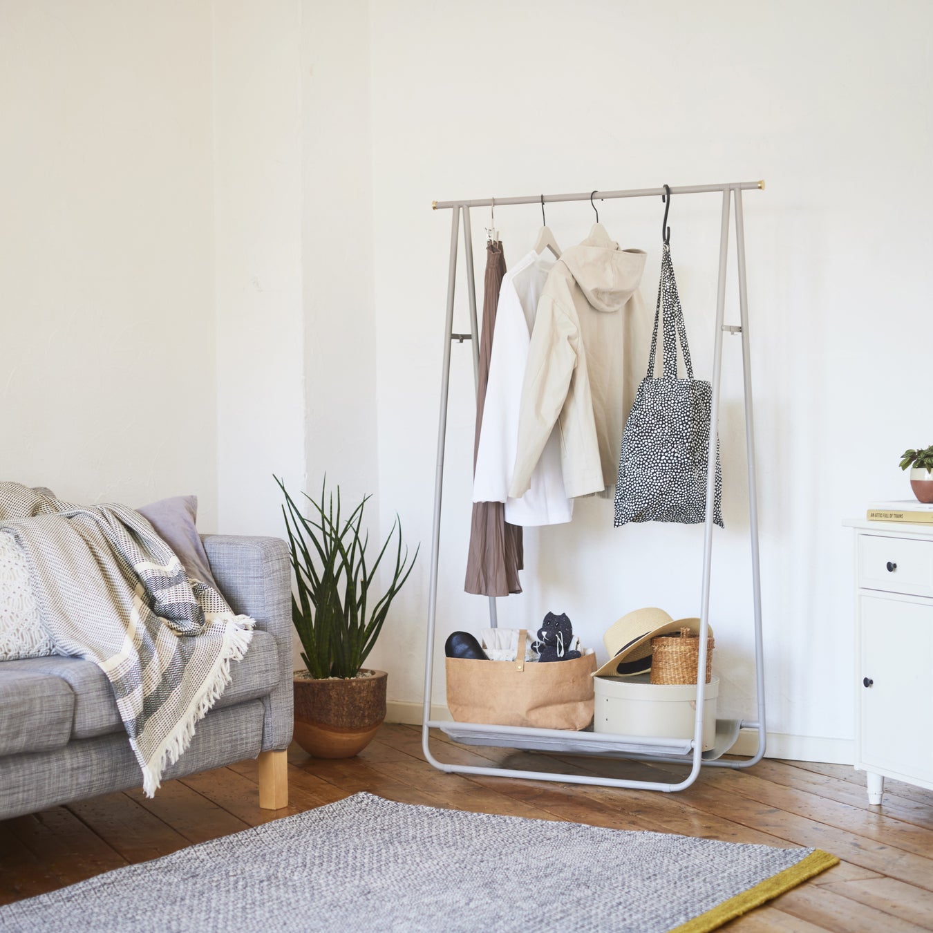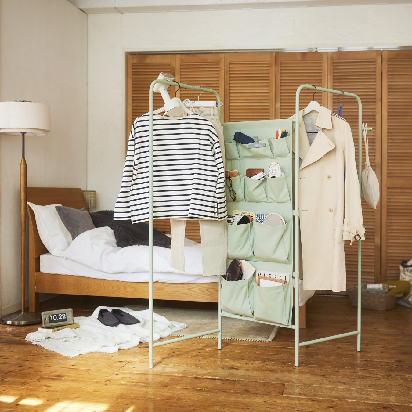 リビングでも寝室でもインテリアになじむ、スリムなハンガーラック。クローゼットだけでは収納が足りない部屋の”ちょい足し収納”にぴったり。バッグや雑貨などの置き場に困るアイテムはファブリックラックにまとめて整頓できるほか、室内物干しとしても使えます。