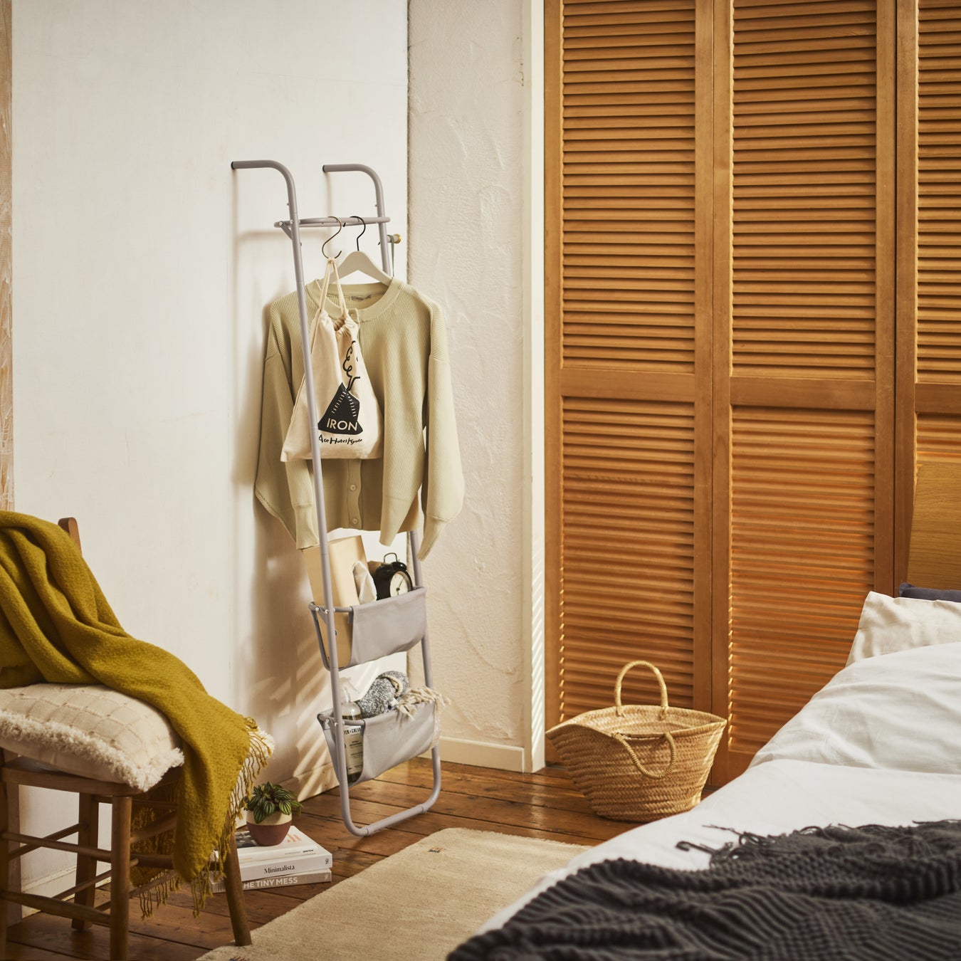 壁に立てかけてお気に入りの衣類や小物を収納できるスリムなラダーラック。ベッド横でリラックスアイテムやブランケットを置いたり、リビングで上着や帽子、ストールなどお出かけアイテムをまとめたり、せまい空間を有効活用できます。取り外し可能なファブリックラックと、帽子や洋服ブラシなどをかけるアームが付いて便利。