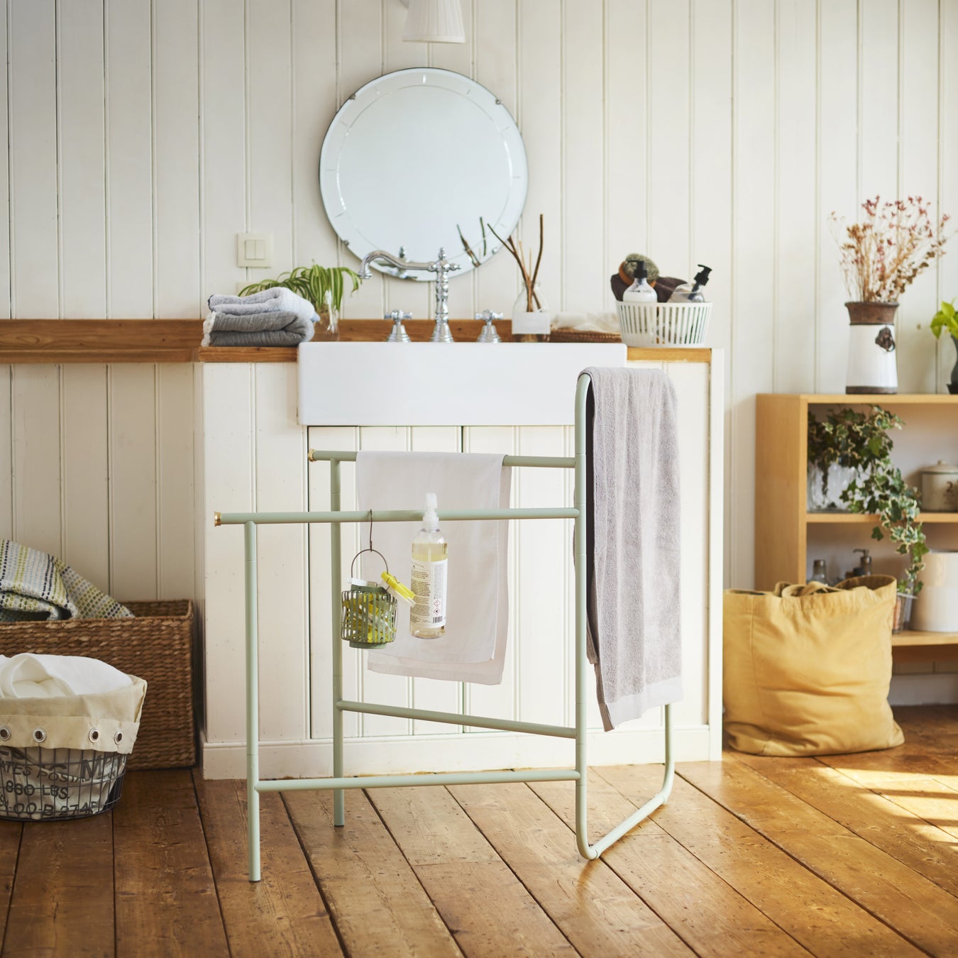 パッと広げてスリムに折りたためる インテリアになじむ軽量タオルスタンド