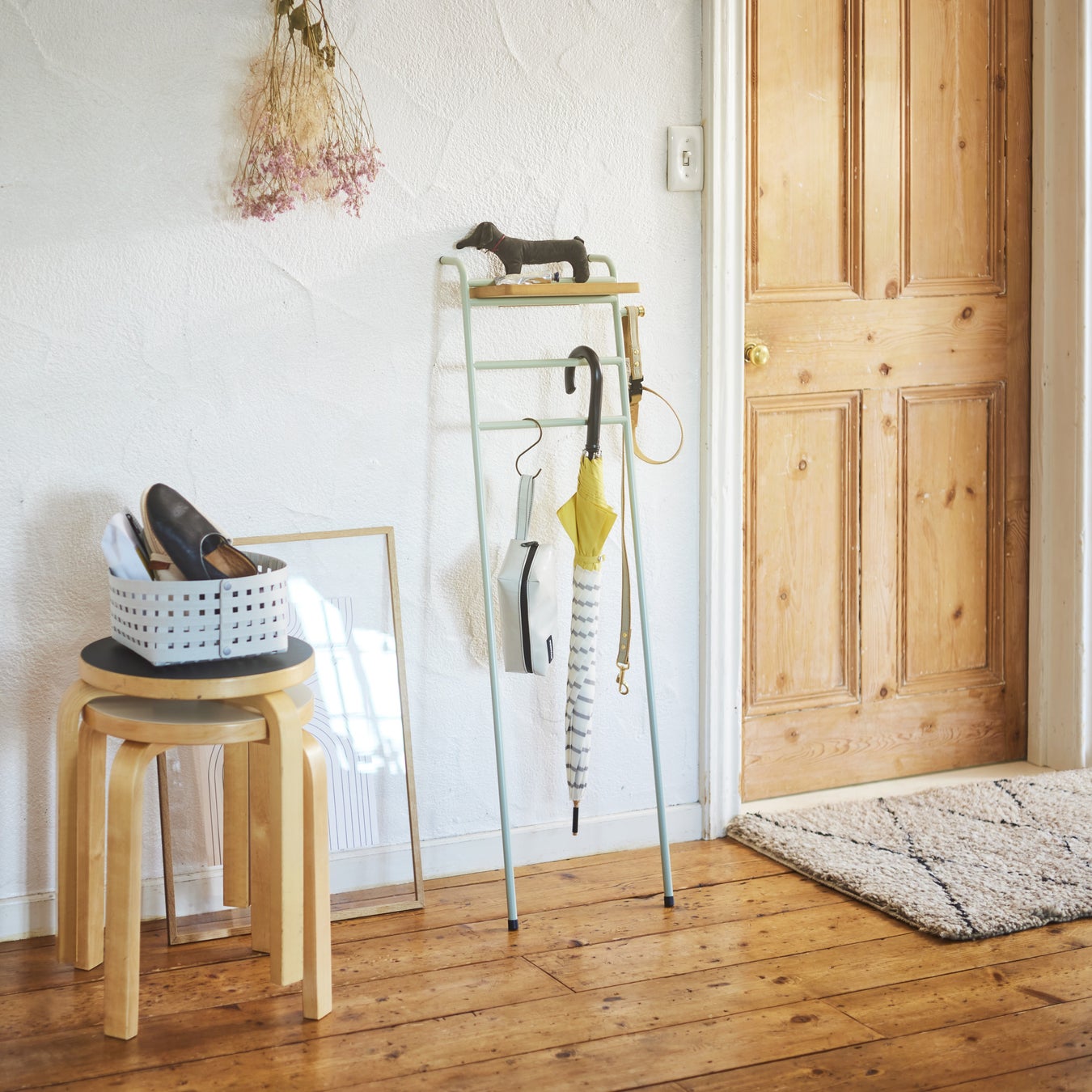 廊下や玄関など限られたスペースでも壁に立てかけて使えるスリムサイズのラック。天板はイヤホンやキーケースなど、乱雑になりがちな小物置き場にぴったりです。下のバーは長傘をかけるのにちょうどよく、レインコートや折りたたみ傘なども収納できます。サイドのアームにはエコバックやペット用リードなどをかけられて便利。外出時に必要なアイテムをコンパクトに整頓でき、お出かけ前の身支度がスマートに整います。