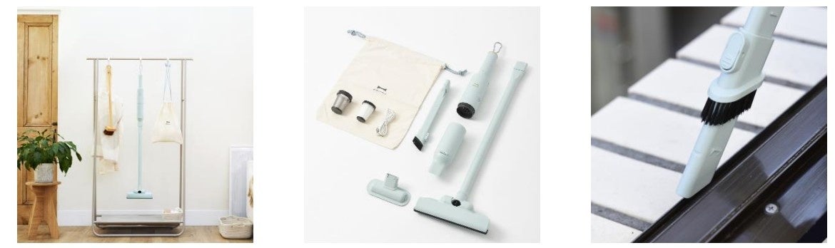 約840gの軽量とこだわり設計、洗練されたニュアンスカラーが特徴の掃除機が登場。すき間掃除やソファなどに使用できるオプションパーツが付属し、家じゅうどこでも活躍します。本体上部にはストラップを搭載し、ラックなどに吊り下げることも可能です。オプションパーツを入れて置ける収納袋も同封。収納場所には困りません。