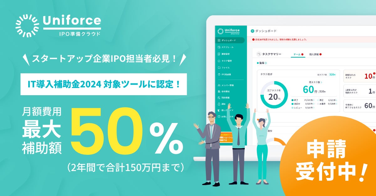 企業フェーズに合わせて持続的な成長の基盤を構築する「ガバナンスグロース」を企業ミッションに掲げ、「ITxコンサルティング」の力でDXを推進するテックカンパニーであるUniforce株式会社(代表取締役CEO:砂田 和也、以下「当社」)は、当社が運営する「IPO準備クラウド」がIT導入補助金2024対象ツールに認定されたことをご報告します。リソース不足などでガバナンスが未整備のままだったスタートアップにも、導入のきっかけにしていただけると嬉しいです。