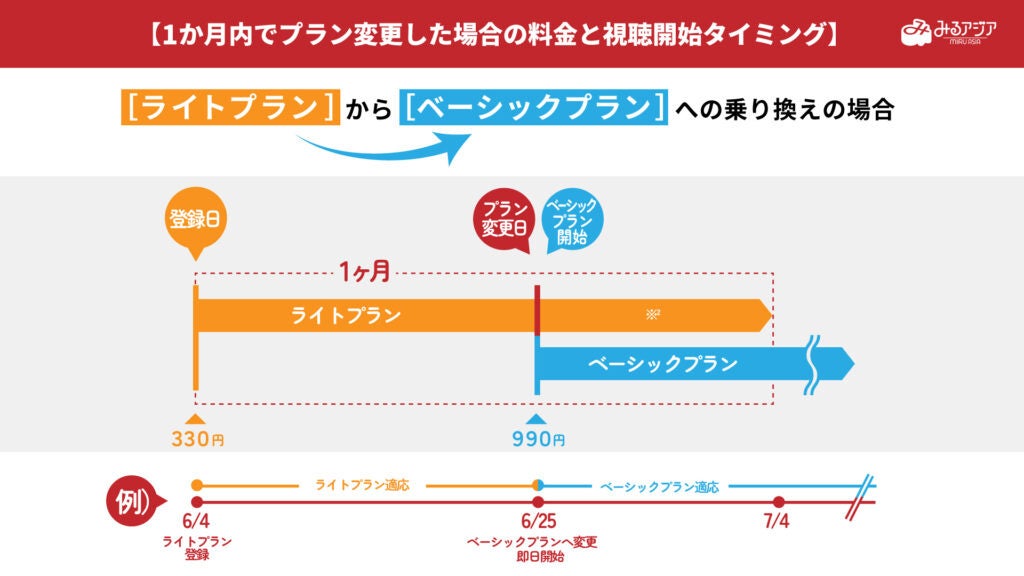 1か月内で、有料プラン変更した場合の料金と視聴開始タイミングについて以下になります。