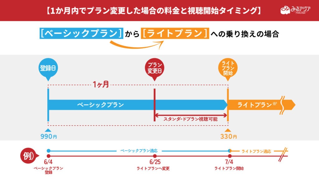 ※ライトプラン契約途中での、ベーシックプランへ変更となったタイミングで、視聴開始およびベーシックプランが発生することになります。