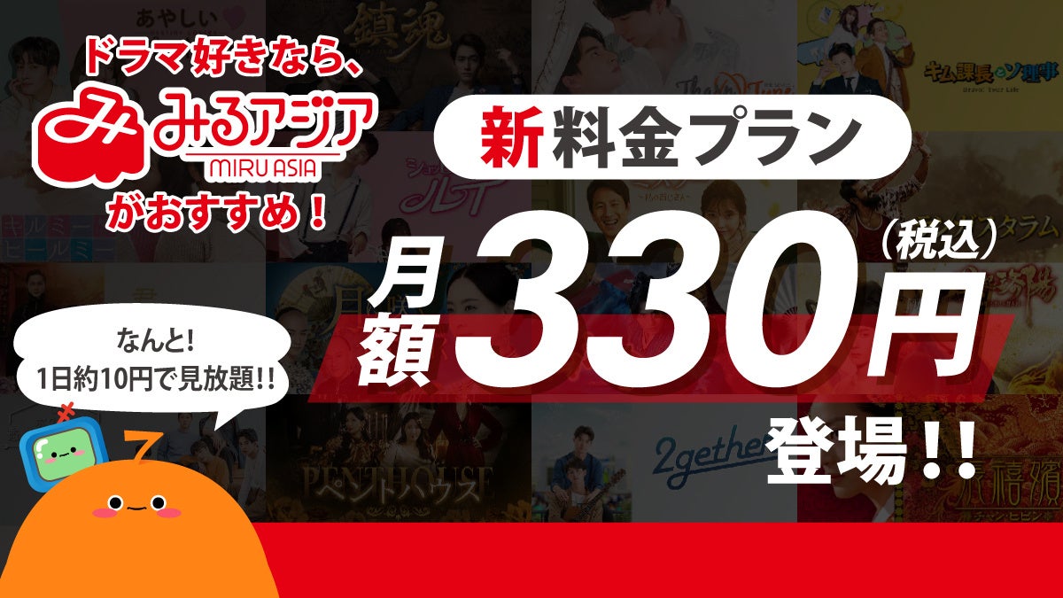 アジアドラマに特化した動画配信サービス「みるアジア」は「1日約10円で見放題(※)」となる新料金プラン「ライトプラン 月額330円(税込)」を6月3日(月)より開始しました!