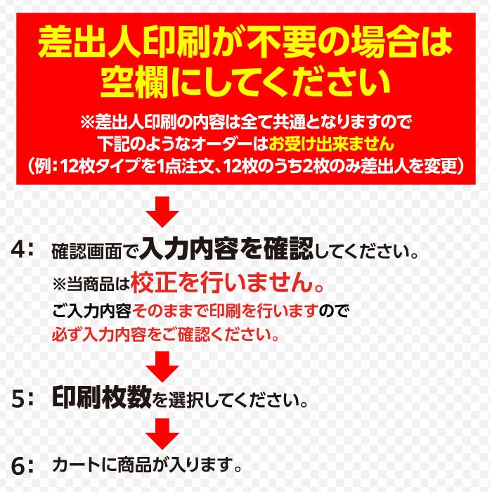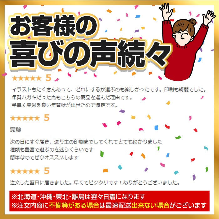 ・頼んで良かったです!今まで自分で作成していましたが、インク代も高いし、疲れるし大変でした。が、今年から頼んだ方が楽だなと思い、思い切って頼んでみました。注文して即到着しましたし、出来上がりも完璧でした。またお願いしたいと思います。