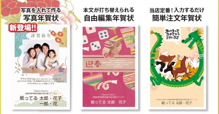 入力するだけの簡単注文年賀状はもちろん、本文が打ち替えられる自由編集年賀状、写真が入れられる写真年賀状と3パターンをご用意。最小12枚からのご注文が可能です。