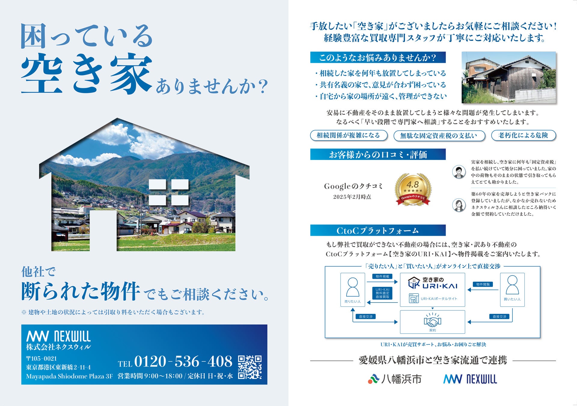 八幡浜市役所(愛媛県八幡浜市:市長 大城一郎)と空き家の買い取り再販事業を手掛ける株式会社ネクスウィル(東京都港区:代表取締役 丸岡 智幸)は、市内の空き家問題を相互連携し解決していきます。
