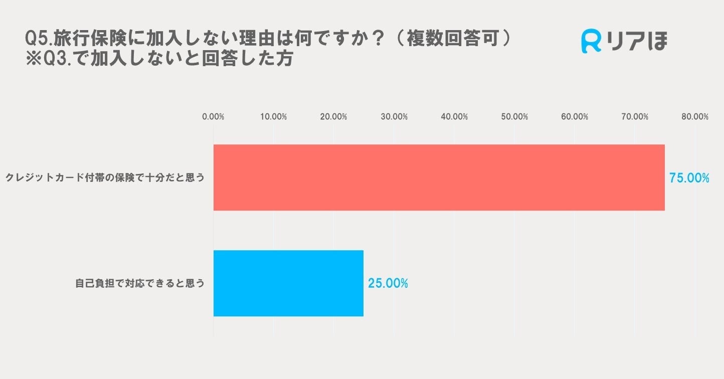 旅行保険に加入しない理由として、75.00%の人がクレジットカード付帯の保険で十分だと考えていることが分かりました。また、25.00%の人が自己負担で対応できると考えています。