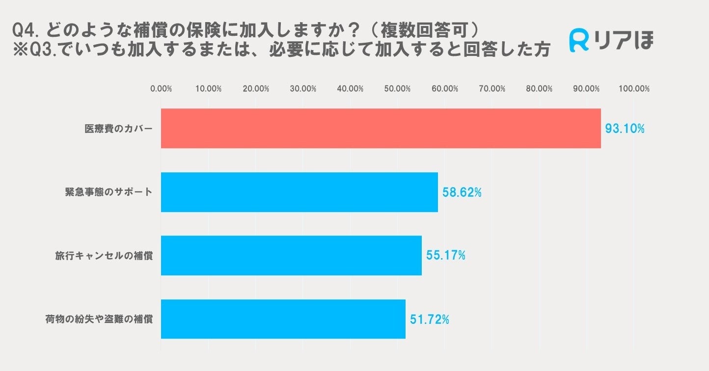 旅行保険の補償内容として最も重要視されているのは医療費のカバーで、93.10%の人がこの補償に加入しています。次いで緊急事態のサポート、旅行キャンセルの補償、荷物の紛失や盗難の補償が続いています。