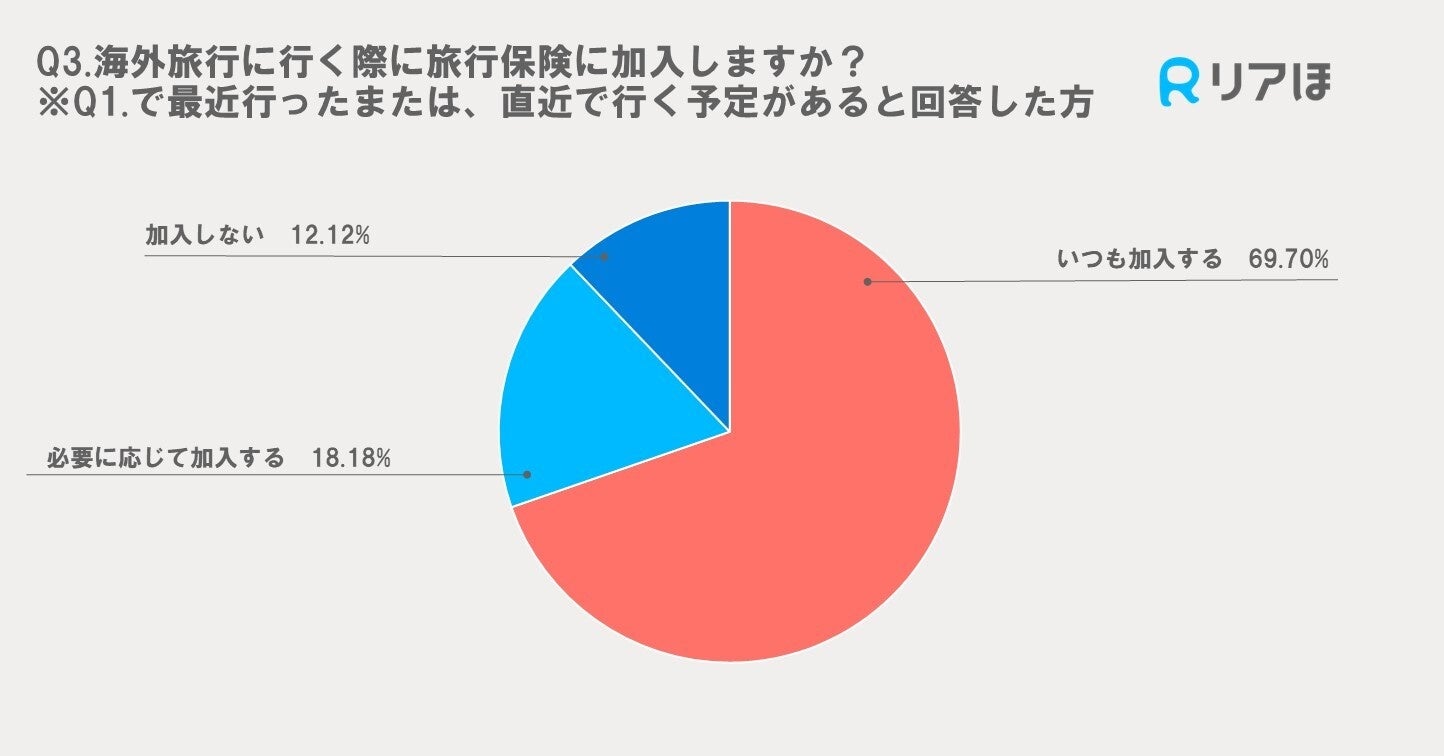 69.70%の人が海外旅行に行く際に常に旅行保険に加入していることが分かりました。また、18.18%の人は必要に応じて加入すると答えています。一方で、12.12%の人は旅行保険に加入しないと答えています。