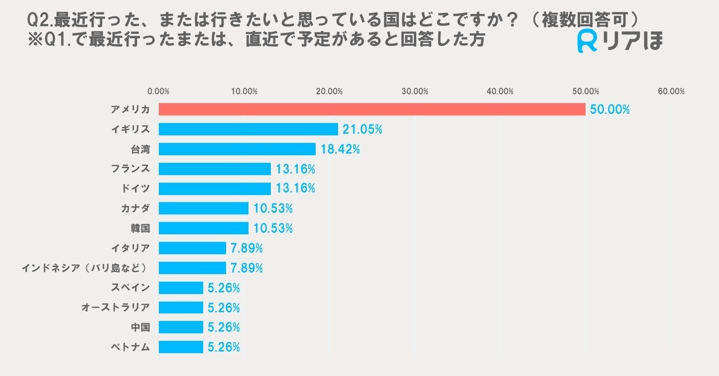 海外旅行先として最も人気のある国はアメリカで、50.00%の人が最近行った、または行きたいと思っていると回答しました。次いで人気のある国はイギリスと台湾で、それぞれ21.05%と18.42%の回答がありました。アジアやヨーロッパの国々も人気があることがわかります。