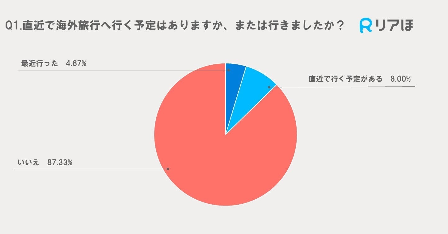 87.33%の人々が直近で海外旅行に行く予定がないと回答しています。一方、4.67%の人が最近旅行へ行ったと答えており、8.00%の人が直近で旅行の予定があると回答しています。全体的に、現在の海外旅行に対する関心は低いようです。